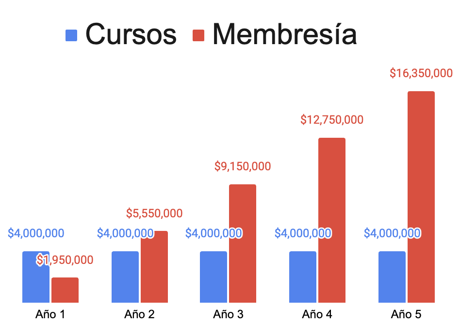 Haciendo un ejercicio simple, si haces 4 lanzamientos al año vendiendo 500 cursos cada lanzamiento a MX$2,000 y el 60% se suscriben a tu membresía por MX$250 los resultados son los siguientes.